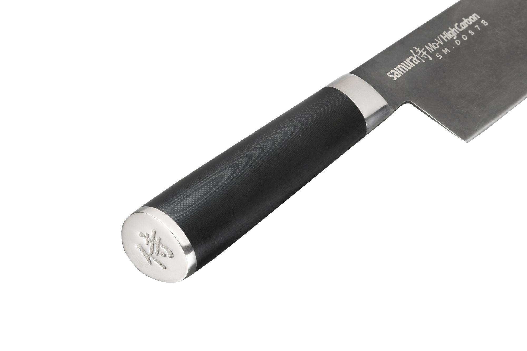Grand Chef Samura Mo-V 240 mm Mo-V Stonewash ist die einfachste Möglichkeit, Kohl zu zerkleinern, Gemüse zu hacken, Salatzutaten zu hacken oder Gastronomie in dünne, portionierte Scheiben zu schneiden.