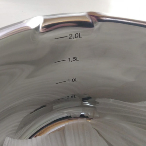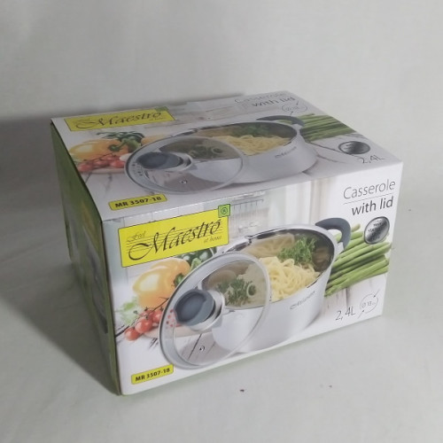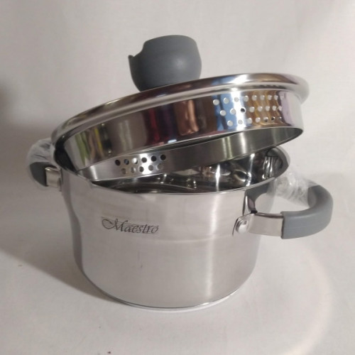 Maestro MR 3507-18 Topf mit einem Volumen von 2,4 Litern, hergestellt aus hochwertigem Edelstahl, hat einen Glasdeckel mit einem Durchmesser von 18 Zentimetern, an der Unterseite des Deckels befindet sich ein Rand mit Löchern zum Abtropfen der Flüssigkeit. Diese Funktion macht die Pfanne ideal zum Kochen von Fadennudeln und Nudeln, da Sie das Wasser ablassen und das fertige Produkt ohne die Hilfe eines Schlauchs trennen können. Die Pfannengriffe aus Stahl sind genietet und mit einer nicht beheizten Unterlage versehen. Im Inneren befindet sich eine Flüssigkeitsvolumenskala.