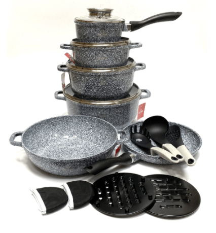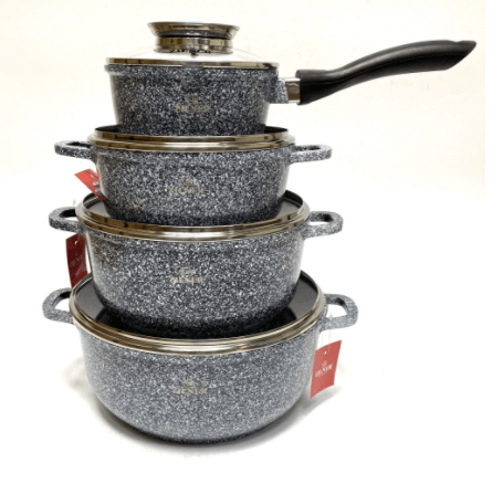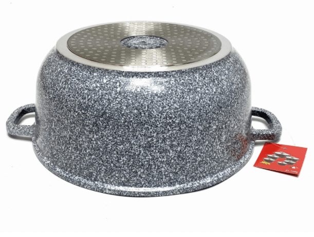 Alle Gefäße des Sets haben einen induktiven ferromagnetischen Boden, wodurch sie perfekt mit allen Arten von Kochfeldern funktionieren, einschließlich Induktionskochfeldern. Die Marmorbeschichtung zeichnet sich durch hohe Antihaft-Eigenschaften aus, ermöglicht das Kochen mit minimalem Fettanteil und ist pflegeleicht.