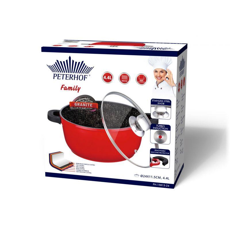 Die Peterhof-Pfanne besteht aus Aluminium, was eine lange Lebensdauer und hervorragende Gebrauchseigenschaften garantiert. Kochgeschirr aus Aluminium oxidiert nicht und lässt sich auch mit Scheuermitteln leicht reinigen. Die großen und bequemen Griffe der Bratpfanne bestehen aus Silikon. Die Griffe erhitzen sich nicht und verrutschen nicht in den Händen.