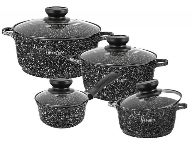8-Elemente-Töpfe aus einer Aluminiumgusslegierung mit einer haftenden Marmor-Keramik-Beschichtung mit einer Beimischung von Granitfeinstoffen (Marmor), die in einem Nanotechnologieverfahren hergestellt wird und eine extrem dichte, kompakte und glatte Schicht auf der Oberfläche erzeugt.
