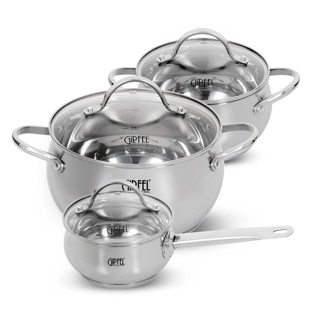 Die eleganten Metallgriffe sind so konstruiert, dass sie beim Kochen auf dem Herd nicht stark heiß werden, wodurch die Verwendung der Töpfe sicher und bequem ist. Transparente, hitzebeständige Glasdeckel mit Dampfaustrittsöffnung ermöglichen es, den Kochvorgang zu beobachten, ohne den Topf anzuheben, was die Wärmespeicherung weiter optimiert.
