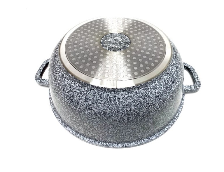 Das Set enthält Glasdeckel mit einem Aroma Knob-Griff, der einen Spender enthält, dank dessen Sie Öl oder flüssige Gewürze während des Kochens oder Dünstens zuführen können. Pfannen aus Aluminiumlegierung haben einen ferromagnetischen Induktionsboden. Sie sind für jede Art von Küche geeignet, einschließlich Induktionsherde.