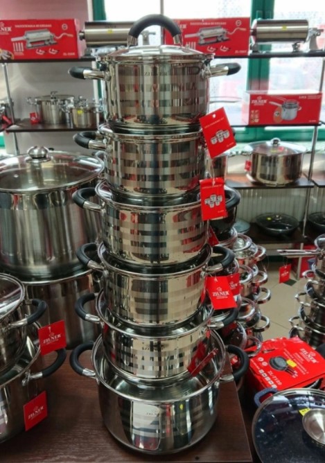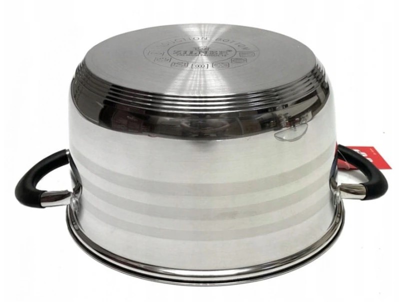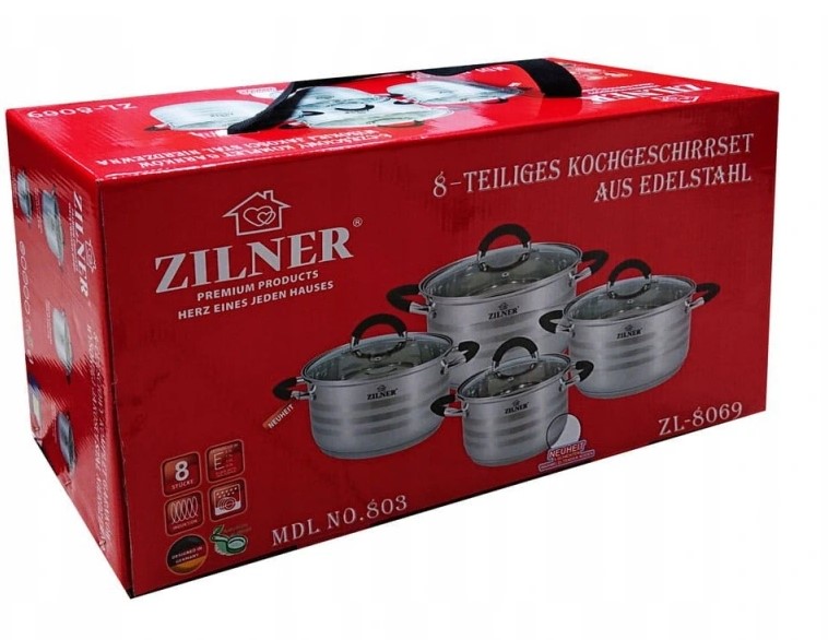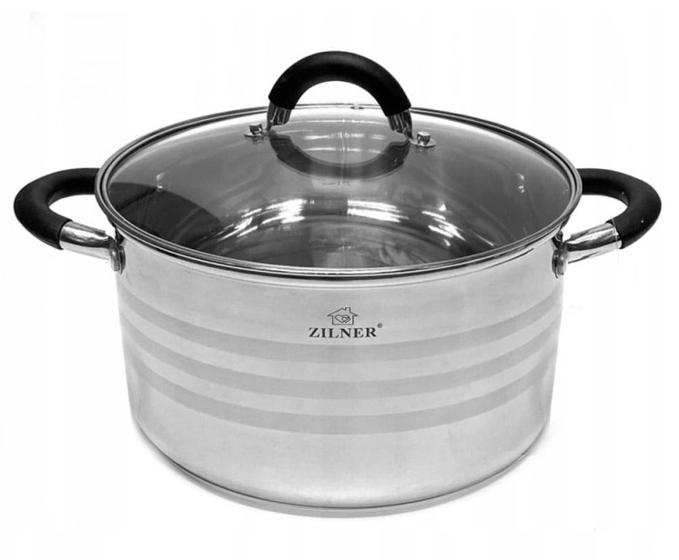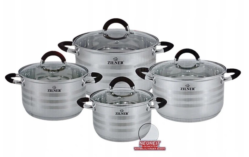 8-teiliges ZILNER Topfset aus Edelstahl. Das Set besteht aus Chrom-Nickel-Stahl und ist rostfrei, robust und langlebig. Das verwendete Material ist nicht nur das Beste, sondern sieht auch super aus, ist extrem pflegeleicht und hat bakterizide Eigenschaften. Das Geschirrset ist außen satiniert (sie haben glänzende Bänder) und innen glänzend. Ferromagnetischer 5-Schicht-Akuthermboden (5 mm) mit einer Aluminiumschicht garantiert eine hervorragende Wärmeverteilung und -speicherung. Alle Töpfe im Set können auf allen Herdarten, einschließlich Induktionsherden, verwendet werden. Genietete Griffe (poliert) mit Silikoneinlagen. In jedem Topf befindet sich ein praktischer Messbecher.
