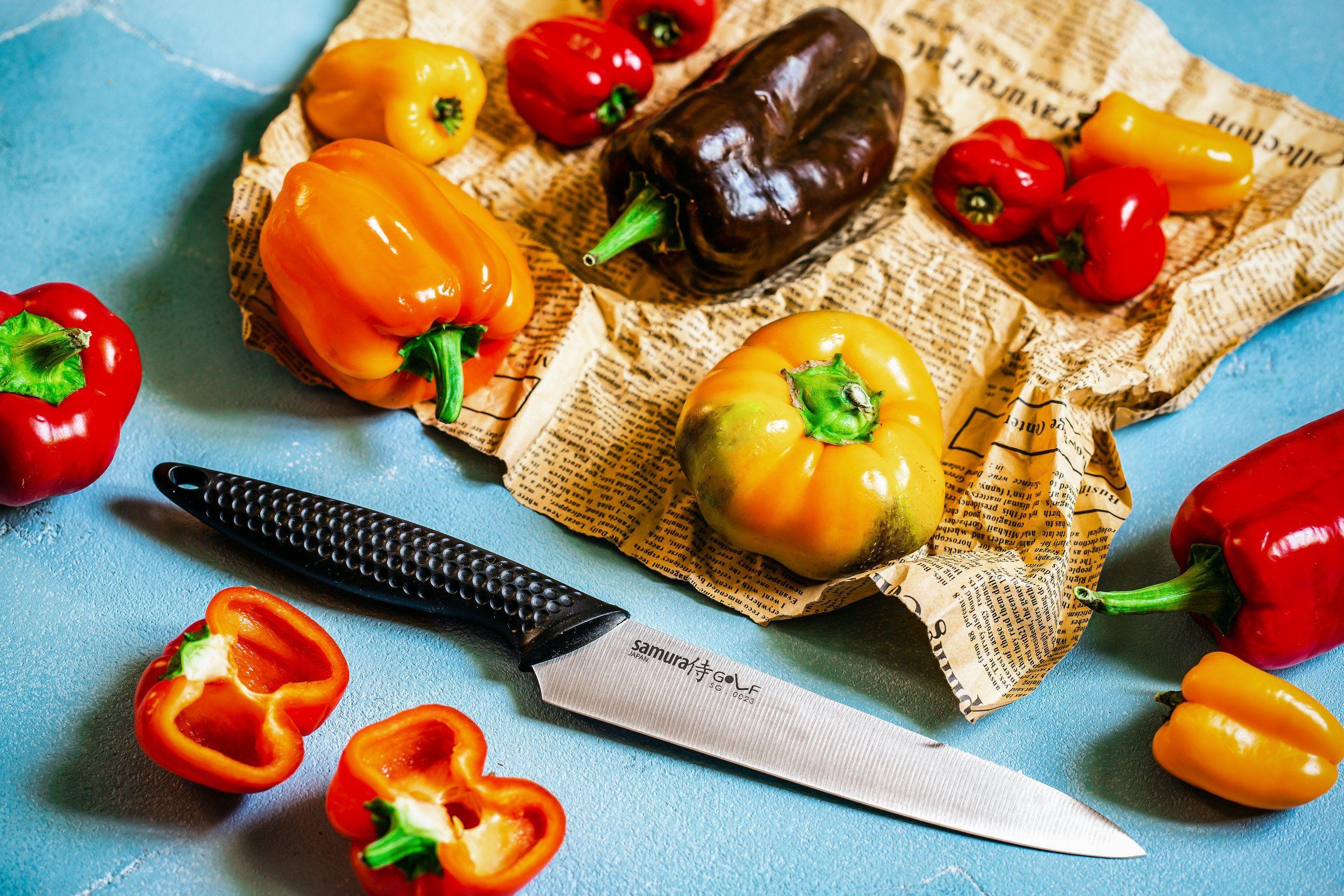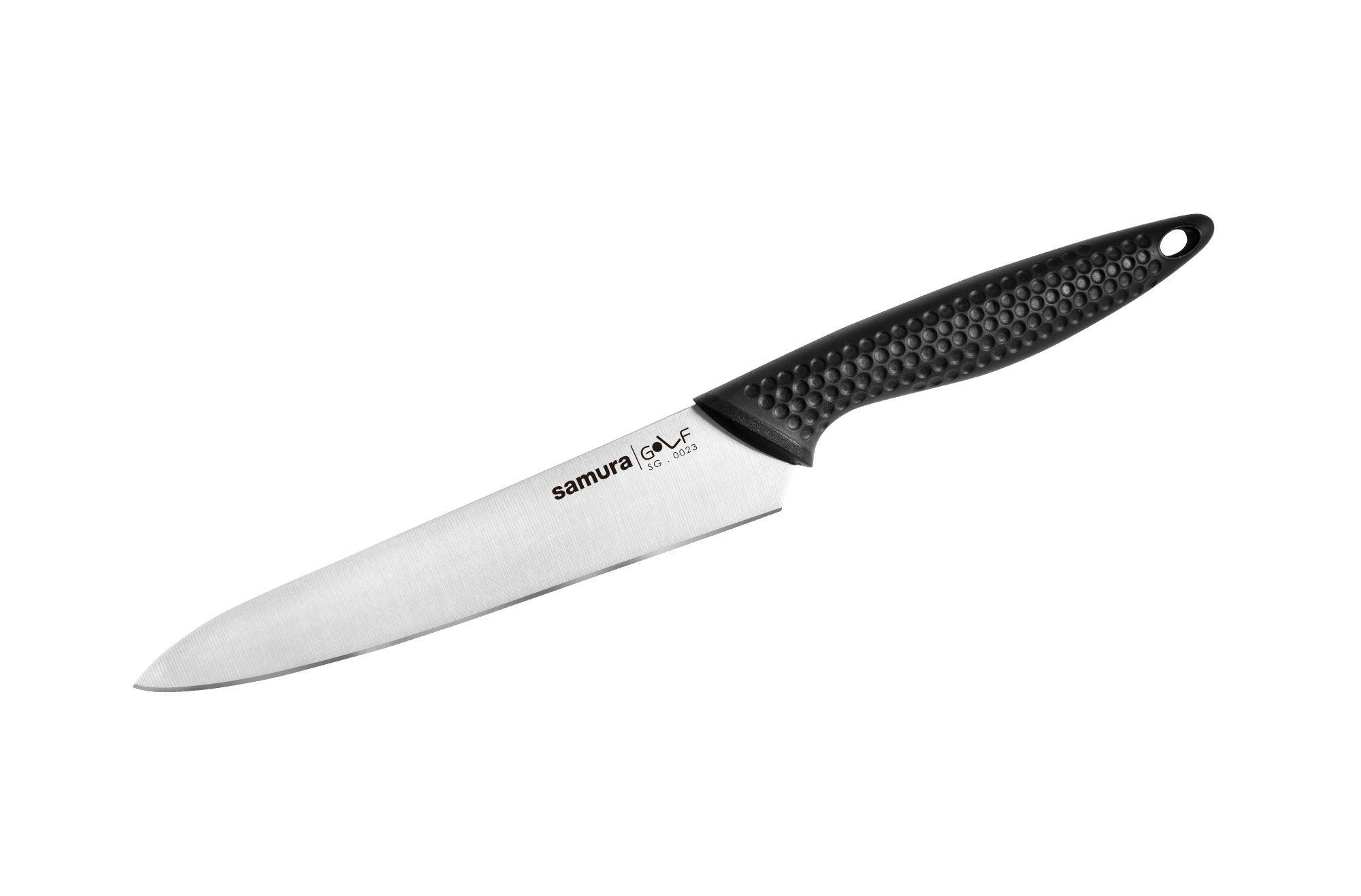 Ein universelles Kochmesser aus hochwertigem AUS-8-Einlagenstahl ist in der Liste der funktionellsten und notwendigsten Küchenmesser enthalten. In Ermangelung hochspezialisierter Typen kann ein solches Messer als würdiger Vertreter der Samura Golf-Serie fast alle Arbeiten für seine Artgenossen erledigen – Gemüse schälen, Fleisch, Fisch, Gebäck und Obst schneiden, Wurst und Käse schneiden, usw.