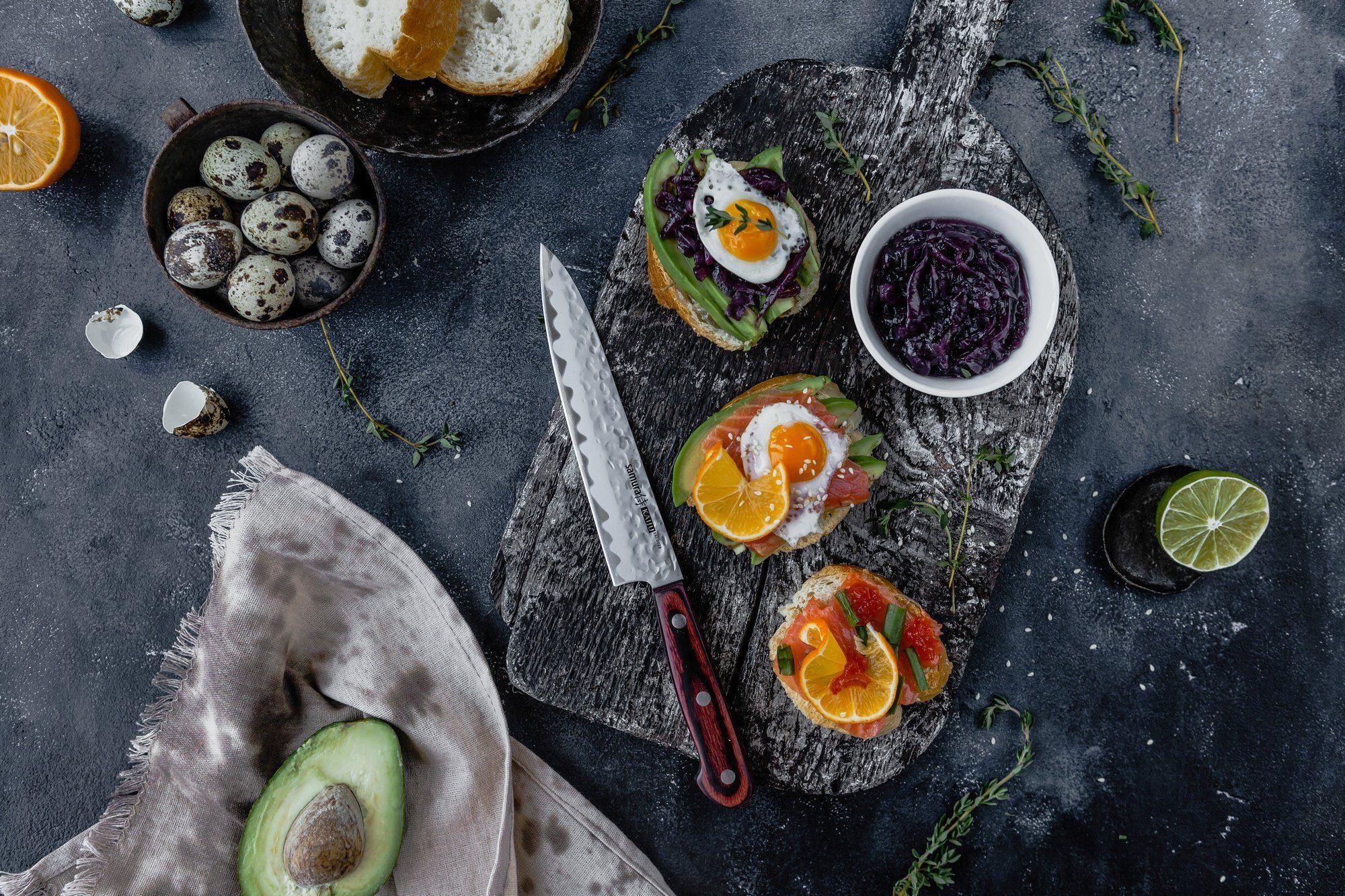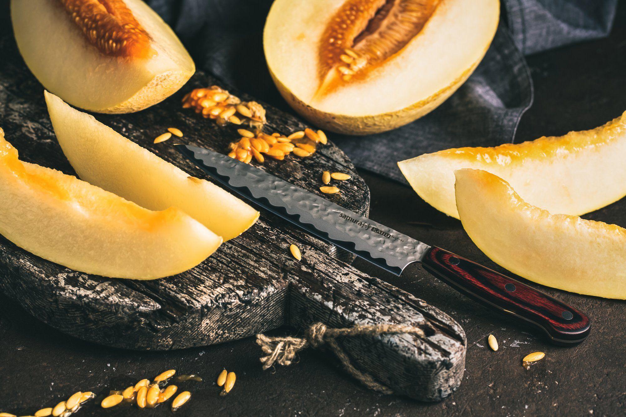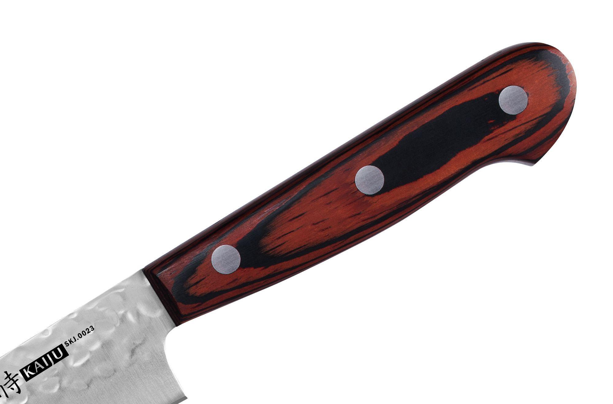 Das Universal-Küchenmesser 150 mm aus der Samura Kaiju Kollektion erfreut seinen Besitzer mit der optimalen Länge der auf 58 HRC gehärteten Klinge, perfekt ausbalanciert mit einem ergonomischen Griff aus stabilisiertem Holz.