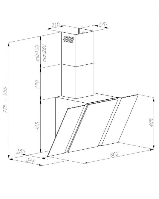 Wandmontierte, 60 cm breite, vertikale (geneigte) Dunstabzugshaube zur effektiven Sammlung von Dämpfen und Gerüchen. Geeignet für den Betrieb sowohl im Abluft- als auch im Umluftmodus.