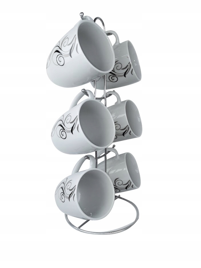 Das Set ist für das Servieren von heißen und kalten Getränken bestimmt. Der Metallständer dient zur bequemen Aufbewahrung der Tassen.