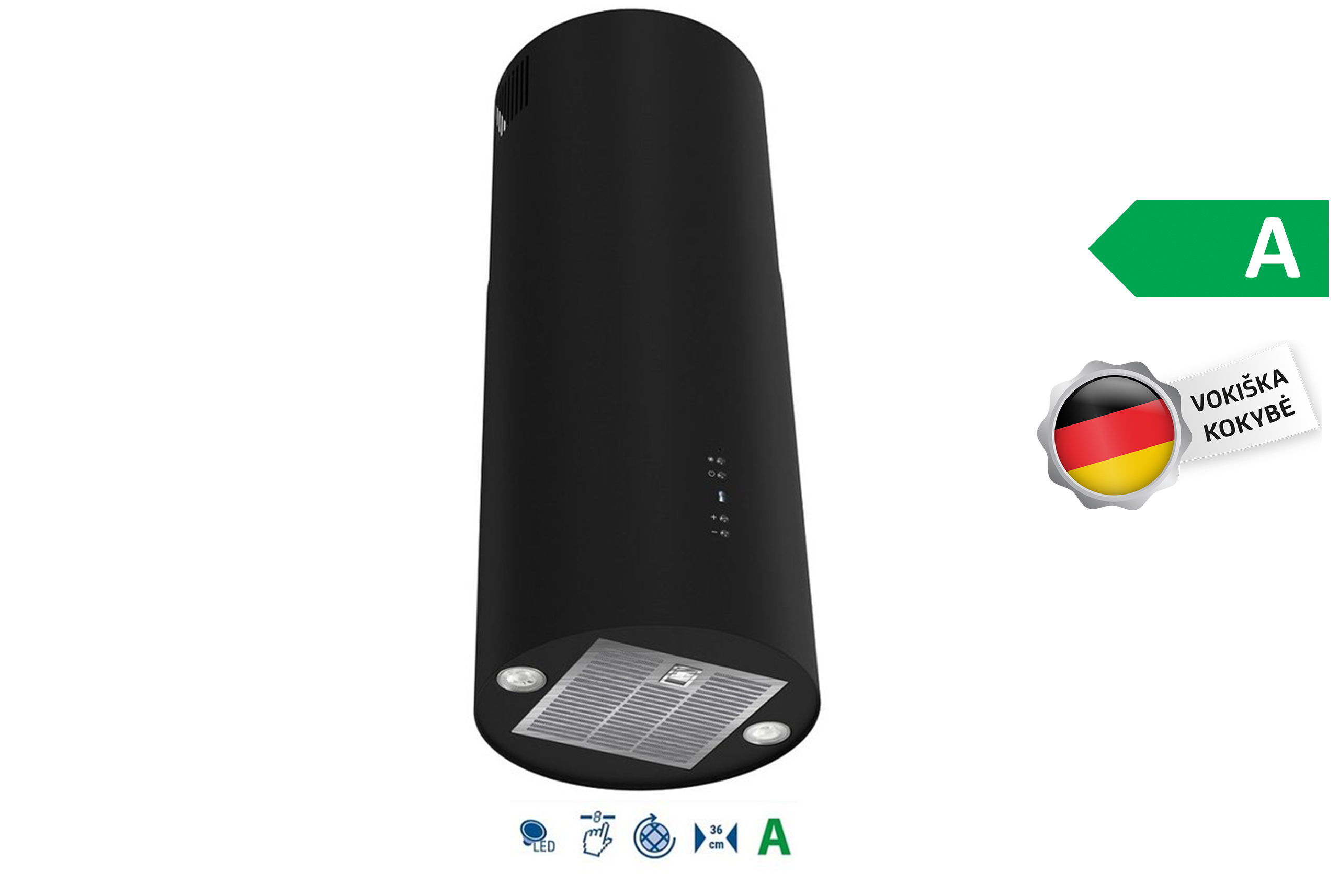 Wir präsentieren den Vlano ROLL 36 Black – eine frei hängende, räumliche Dunstabzugshaube (Inselhaube), die perfekt in moderne Küchen mit Kochinseln passt. Das runde, mattschwarze Edelstahlgehäuse, kombiniert mit Randabsaugung und einem leistungsstarken Motor, sorgt für erstklassige Luftreinheit in Ihrer Küche.