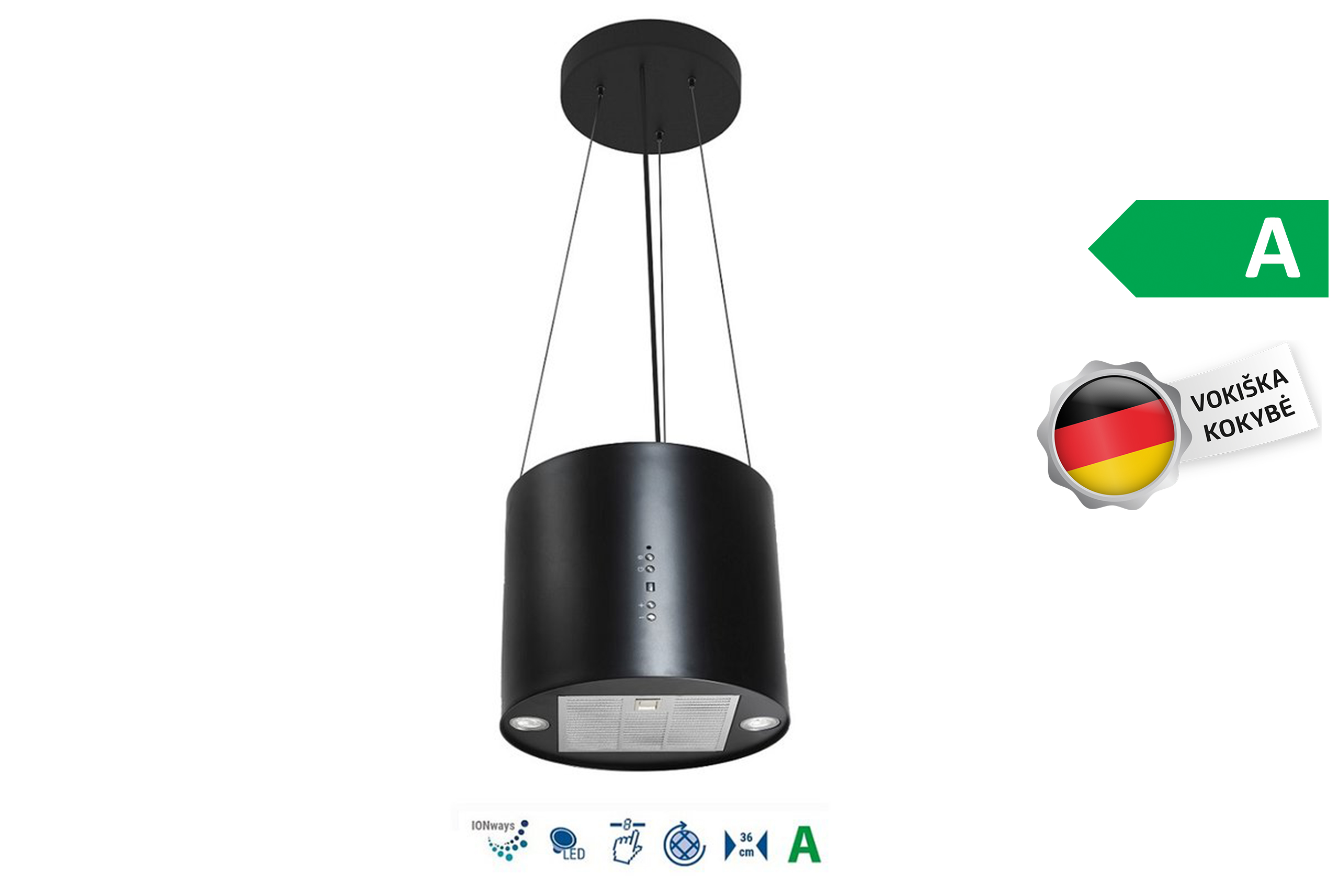 Wir präsentieren den Vlano ROLLION Black – eine frei hängende Inselhaube, die nicht nur Dämpfe absaugt, sondern auch als Luftreinigungsgerät fungiert. Ihr rundes, mattes schwarzes Edelstahl-Gehäuse verleiht Ihrer Küche stilvollen Glanz, während die “IONways”-Technologie für Ihre Raumluftqualität sorgt.