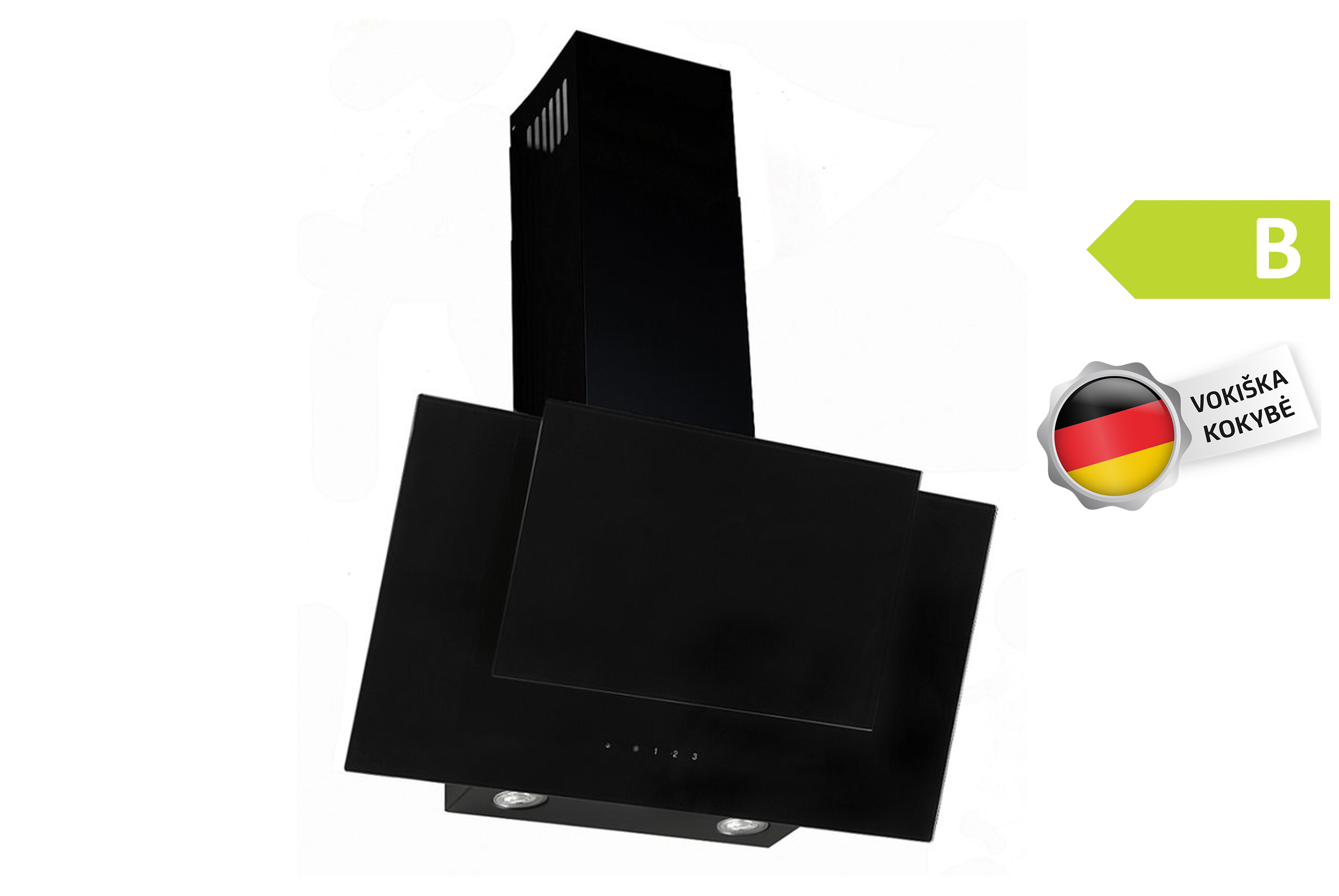 Kaminhaube zur Wandmontage über dem Kochfeld. Geeignet für moderne Küchen, in denen ästhetisches Design, leiser Betrieb und geringer Energieverbrauch gefragt sind.