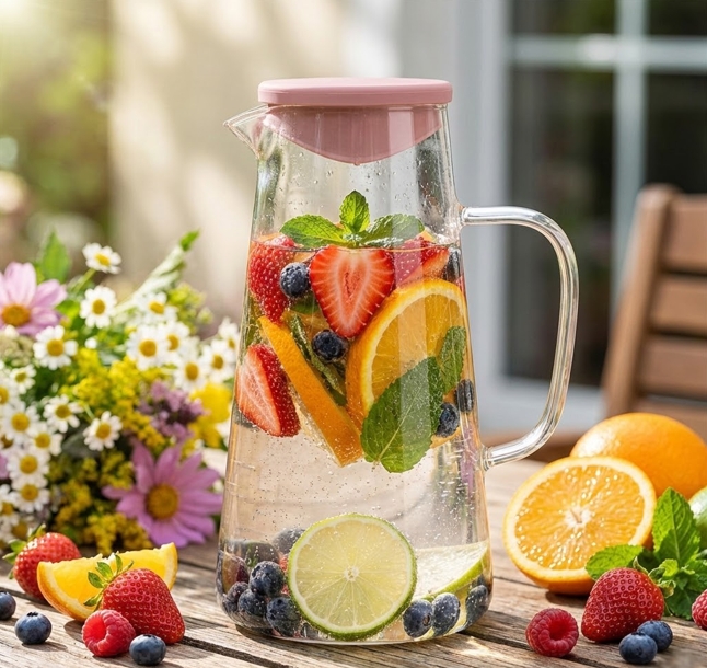 Ein besonderes Merkmal dieses Modells ist der dunkelrosa Silikondeckel. Er belebt nicht nur das Design, sondern verschließt den Krug auch luftdicht und schützt das Getränk vor Staub oder Fremdgerüchen im Kühlschrank. Das Fassungsvermögen von 1,5 Litern ist optimal für den täglichen Wasserverbrauch sowie für die Bewirtung von Gästen mit Limonade oder Eistee.