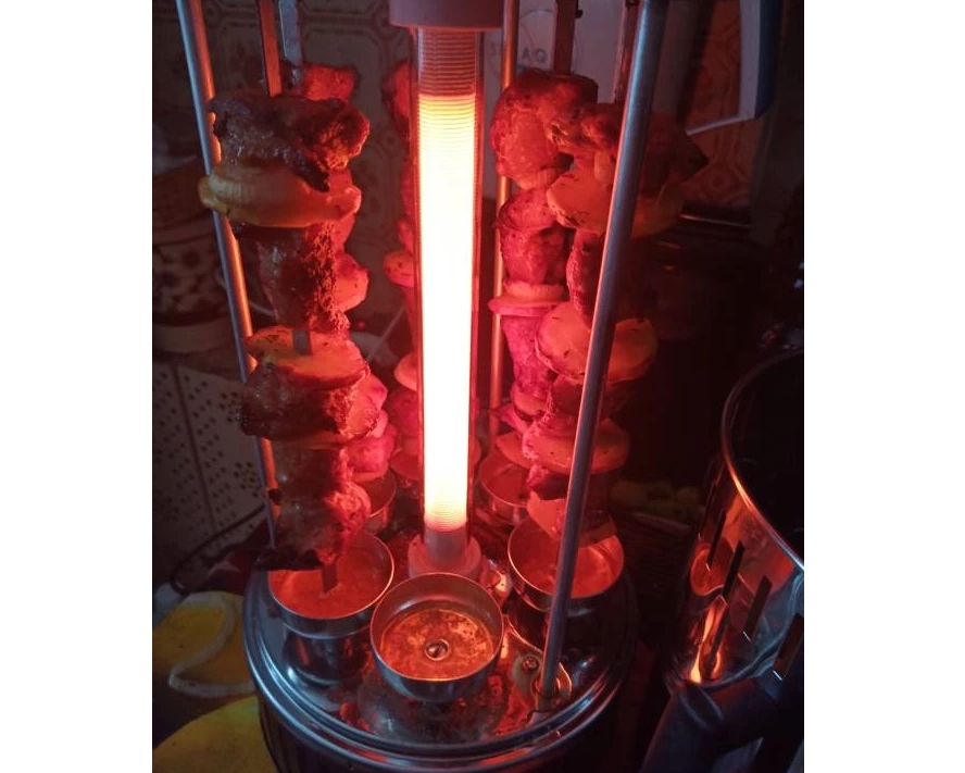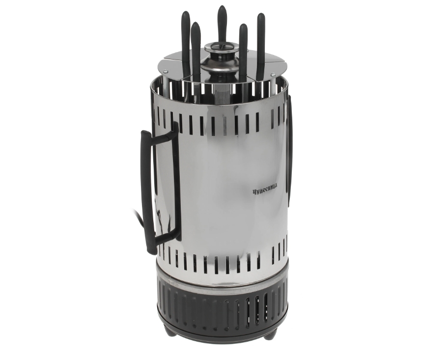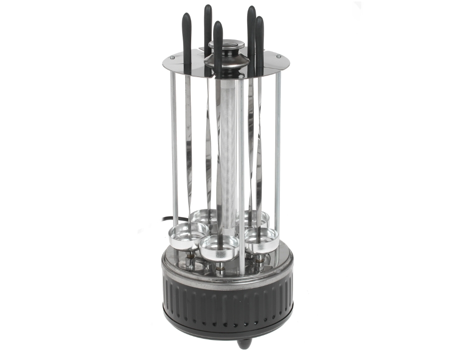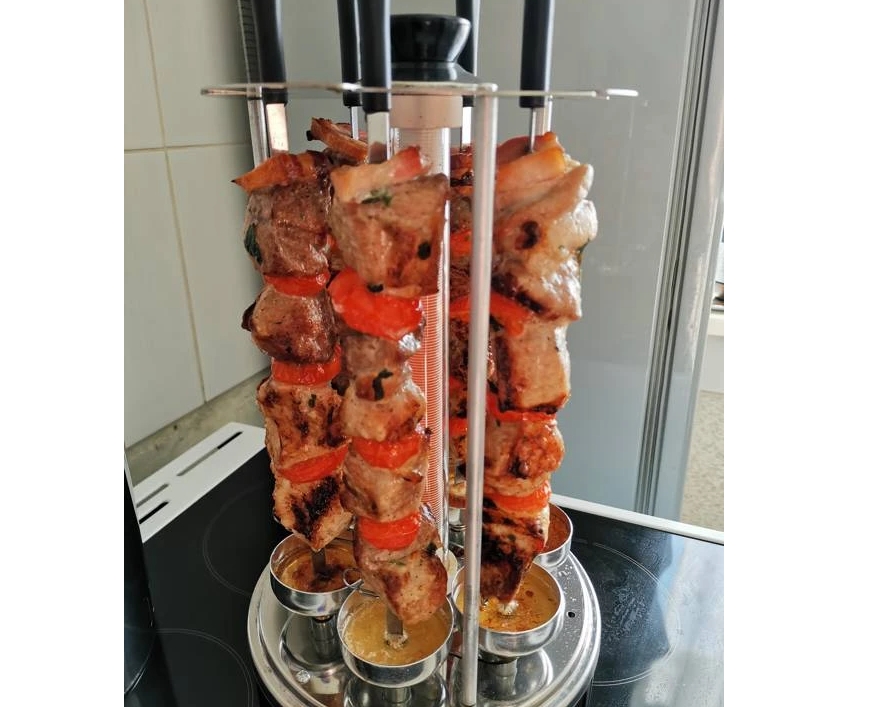 Elektrischer vertikaler Schaschlikgrill für den Hausgebrauch, zum Grillen von Fleisch, Fisch und Gemüse auf Spießen in Innenräumen.