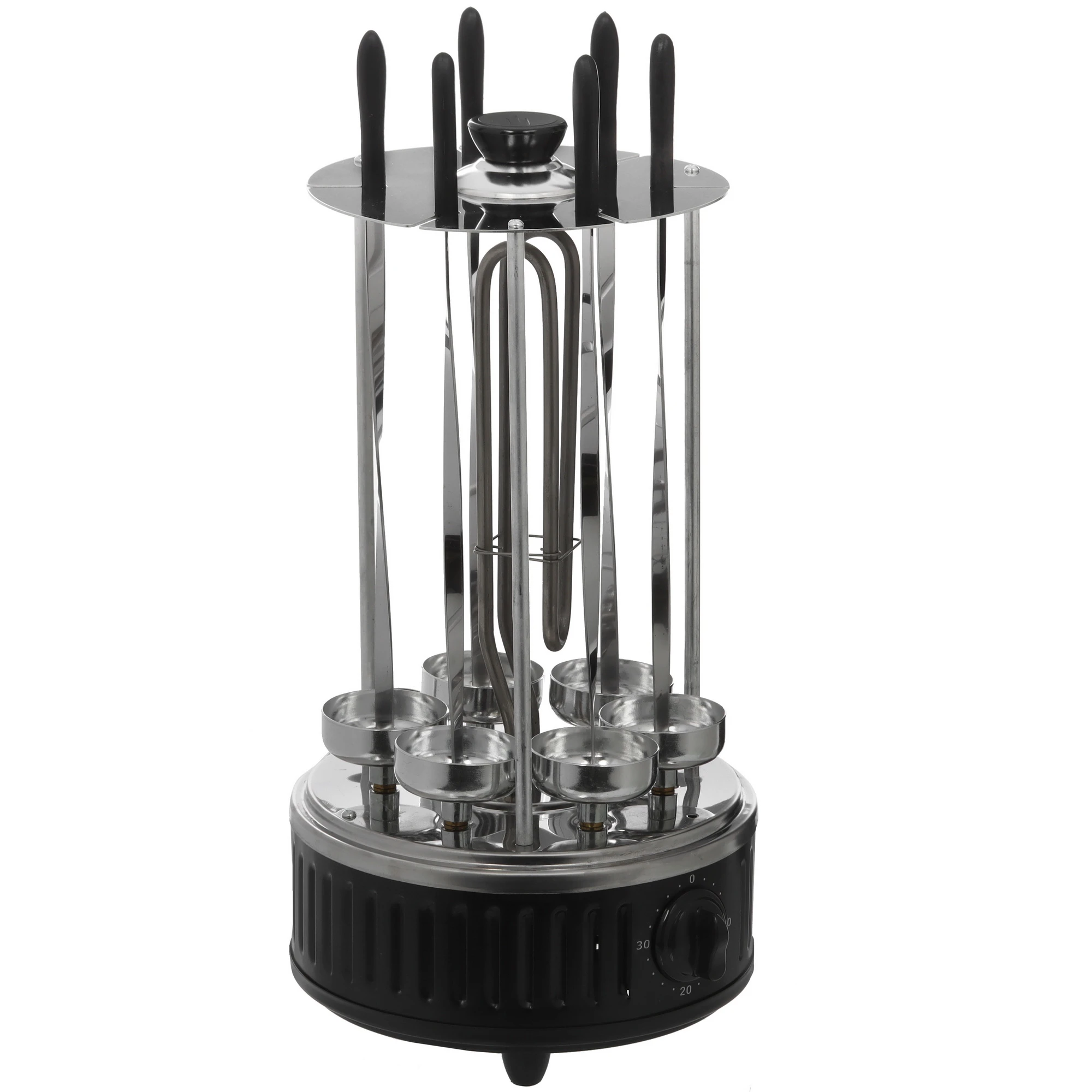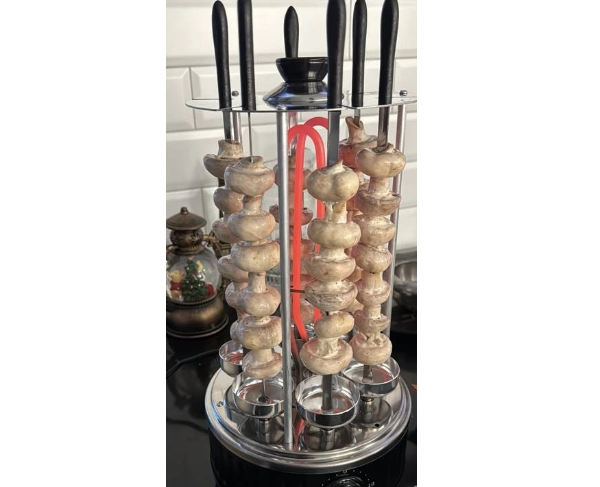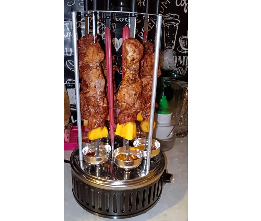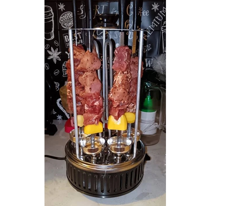 Elektrischer vertikaler Schaschlikgrill für den Hausgebrauch zum Grillen von Fleisch, Fisch und Gemüse auf Spießen in Innenräumen.