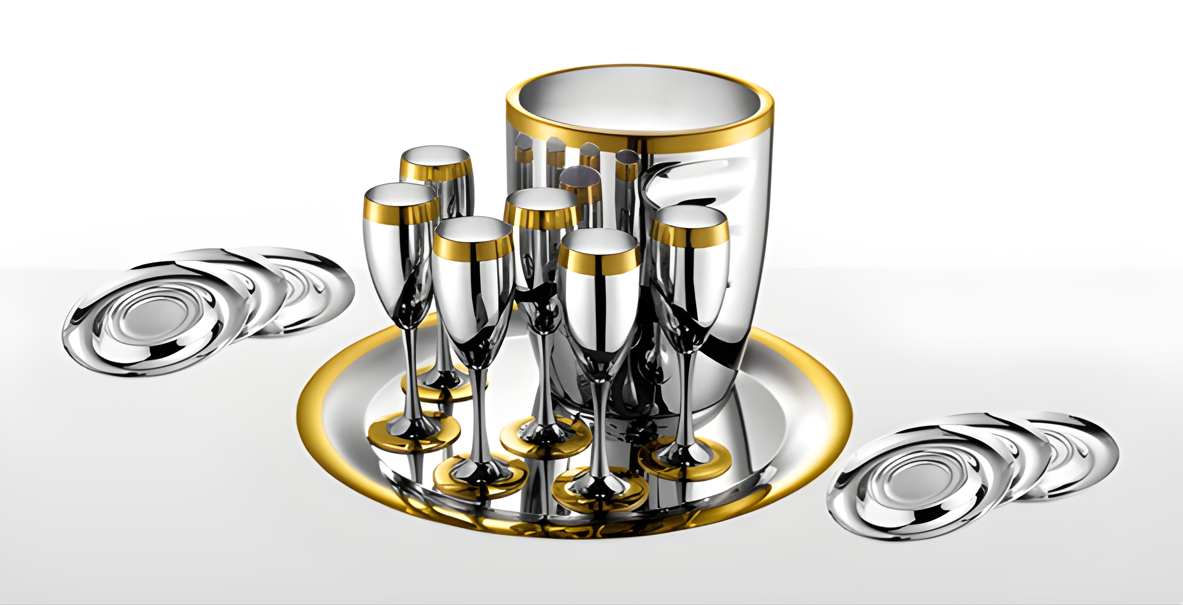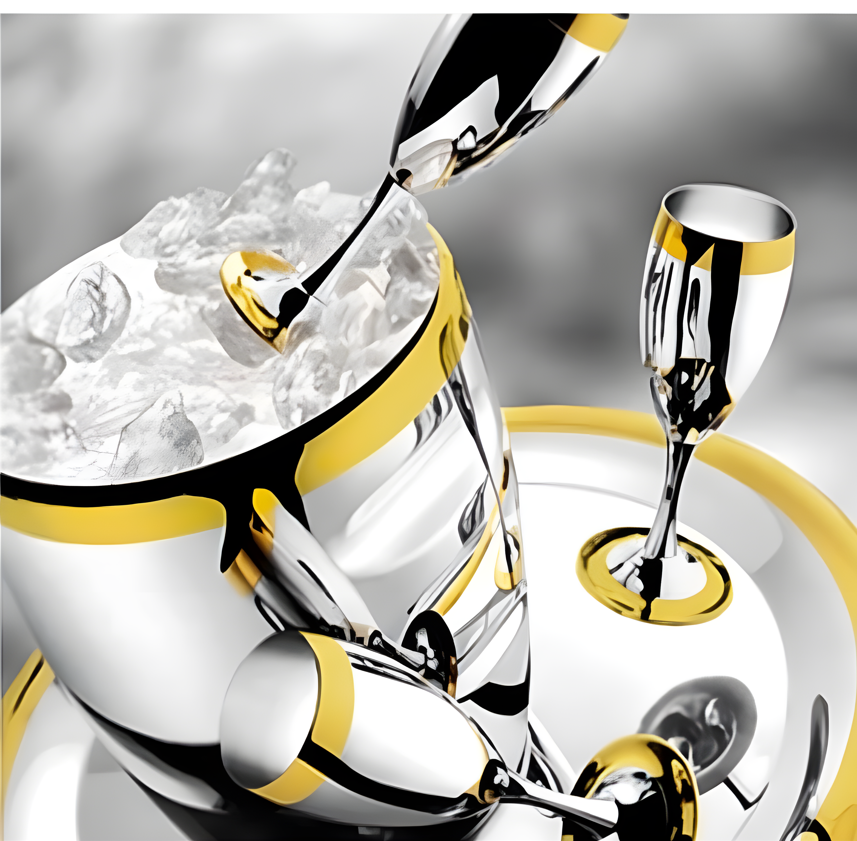 Es ist möglich, Champagner, prickelnden Wein… „LA PERLE“ (“Perle”) von Zepter – schmale Gläser in Tulpenform, Eiskübel und andere notwendige Accessoires zu servieren.