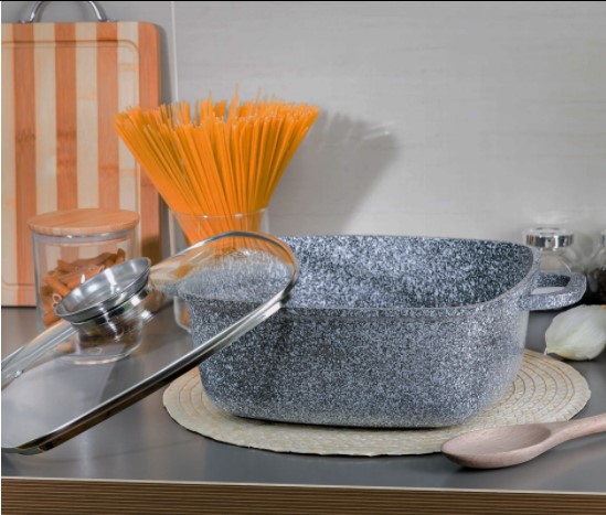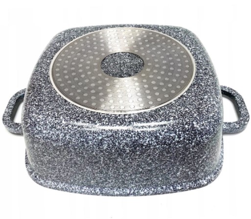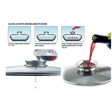 Beschichtet mit Antihaft-Keramik-Marmorbeschichtung. Glasdeckel mit einem “Aromatisierungsknopf”, der einen Ölspender enthält, mit dem Sie beim Braten oder Sautieren Öl oder flüssige Gewürze hinzufügen können. Die Pfanne aus Aluminiumlegierung hat einen ferromagnetischen Induktionsboden. Sie sind für jede Art von Küche geeignet, einschließlich Induktion.