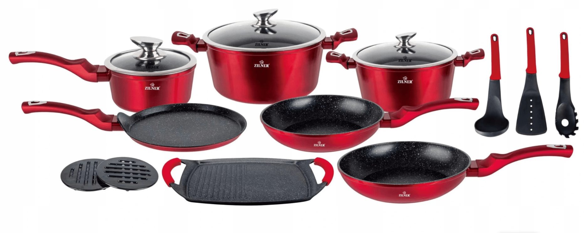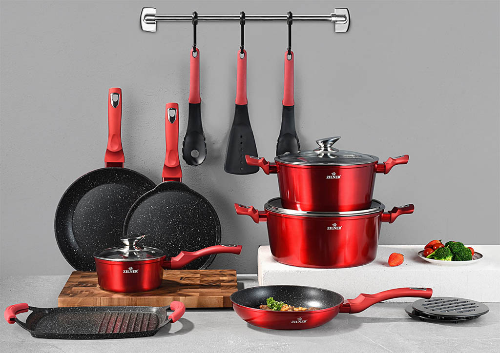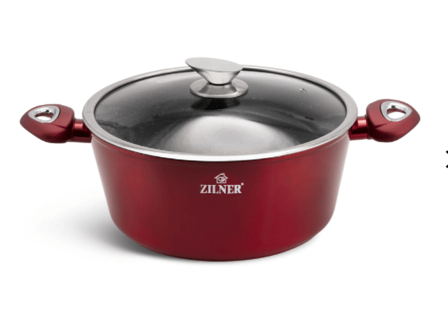 „ZILNER“ Geschirr zeichnet sich durch eine außergewöhnliche Kompatibilität aus – Sie können es auf allen Herdarten verwenden: von Gasherden bis hin zu modernen Induktionskochfeldern. Deckel aus gehärtetem Glas mit speziellen Entlüftungsöffnungen sorgen für sicheres Schmoren, und die im Set enthaltenen Küchenhelfer und Untersetzer ermöglichen es, sofort mit dem Kochen zu beginnen.