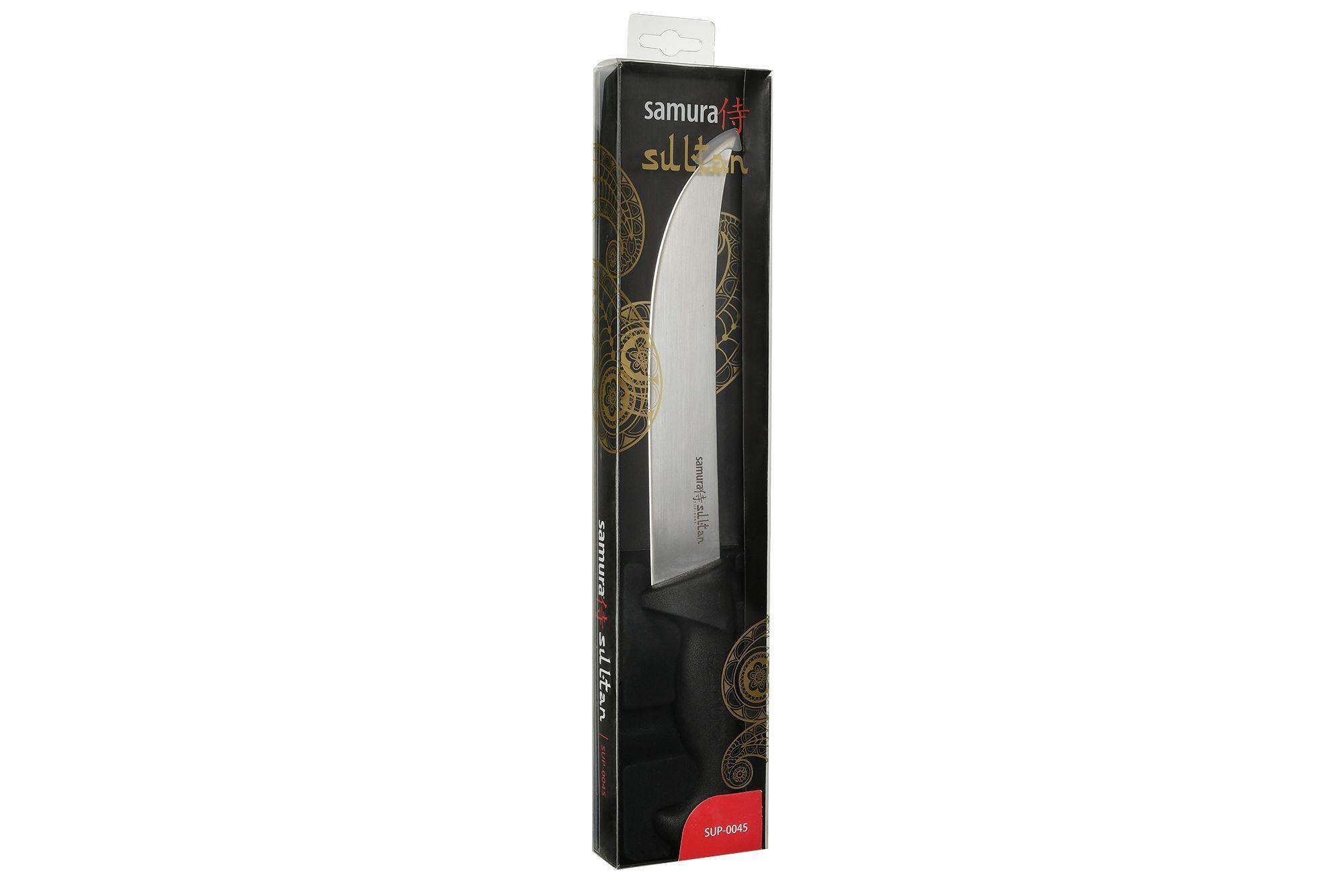 - Das Küchenmesser Sultan Pro, manchmal auch Slicer oder Feinkostmesser genannt, hat eine eher lange und schmale Klinge. Seine Geometrie ist optimal für das filigrane Schneiden verschiedenster Produkte. Mit Hilfe des Samura Sultan Pro Hobels können Sie Balyk, Wurst, Käse, Fleisch und andere Köstlichkeiten ganz einfach in portionierte Stücke schneiden.