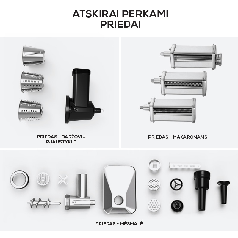 ✅ Möglichkeit, zusätzliches Zubehör zu kaufen (Fleischwolf, Nudelaufsatz, Schneide-/Reibevorsatz).